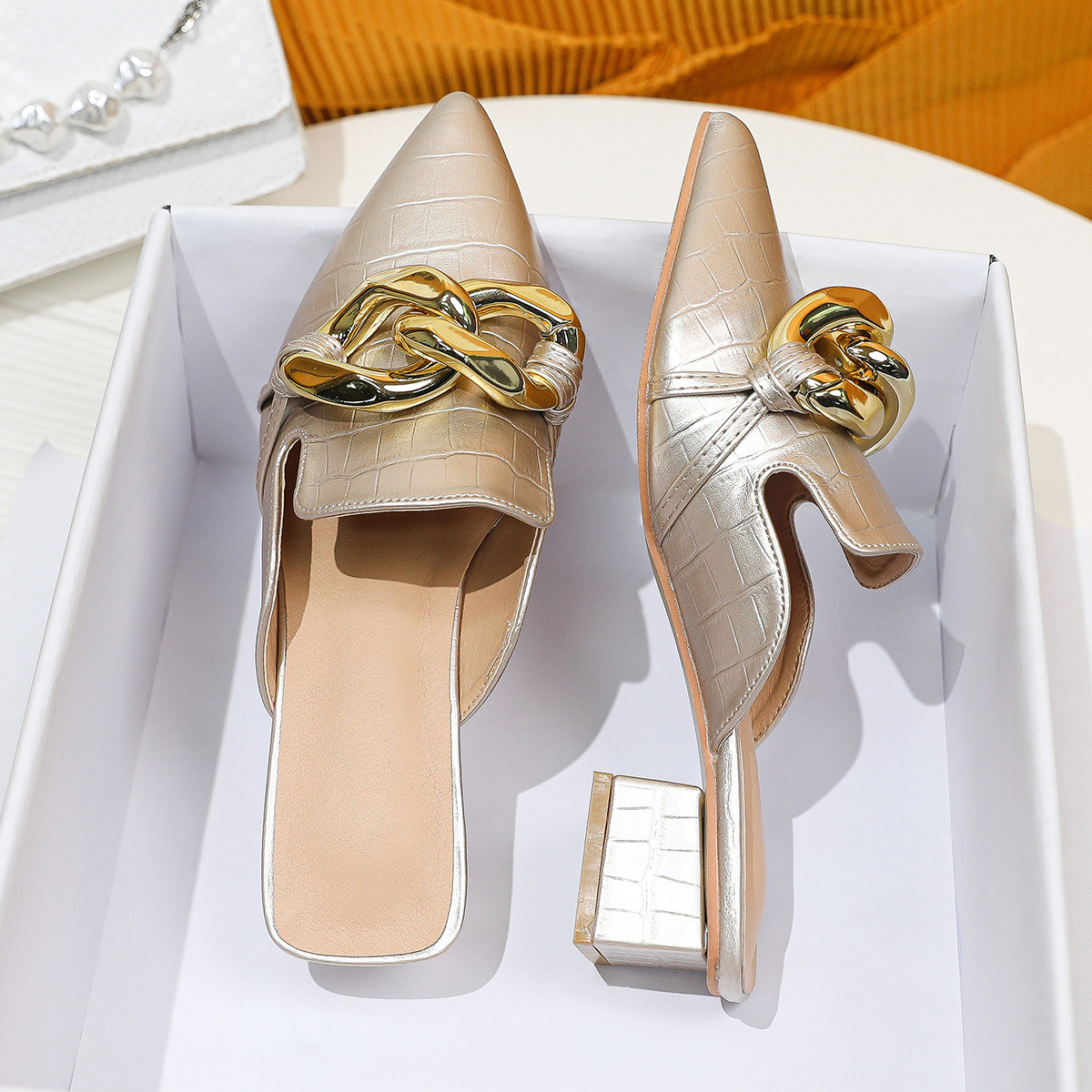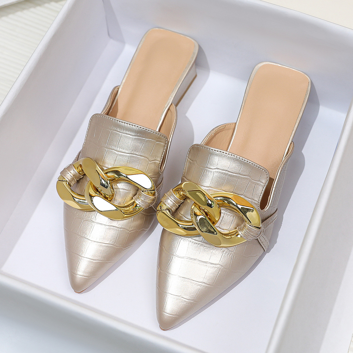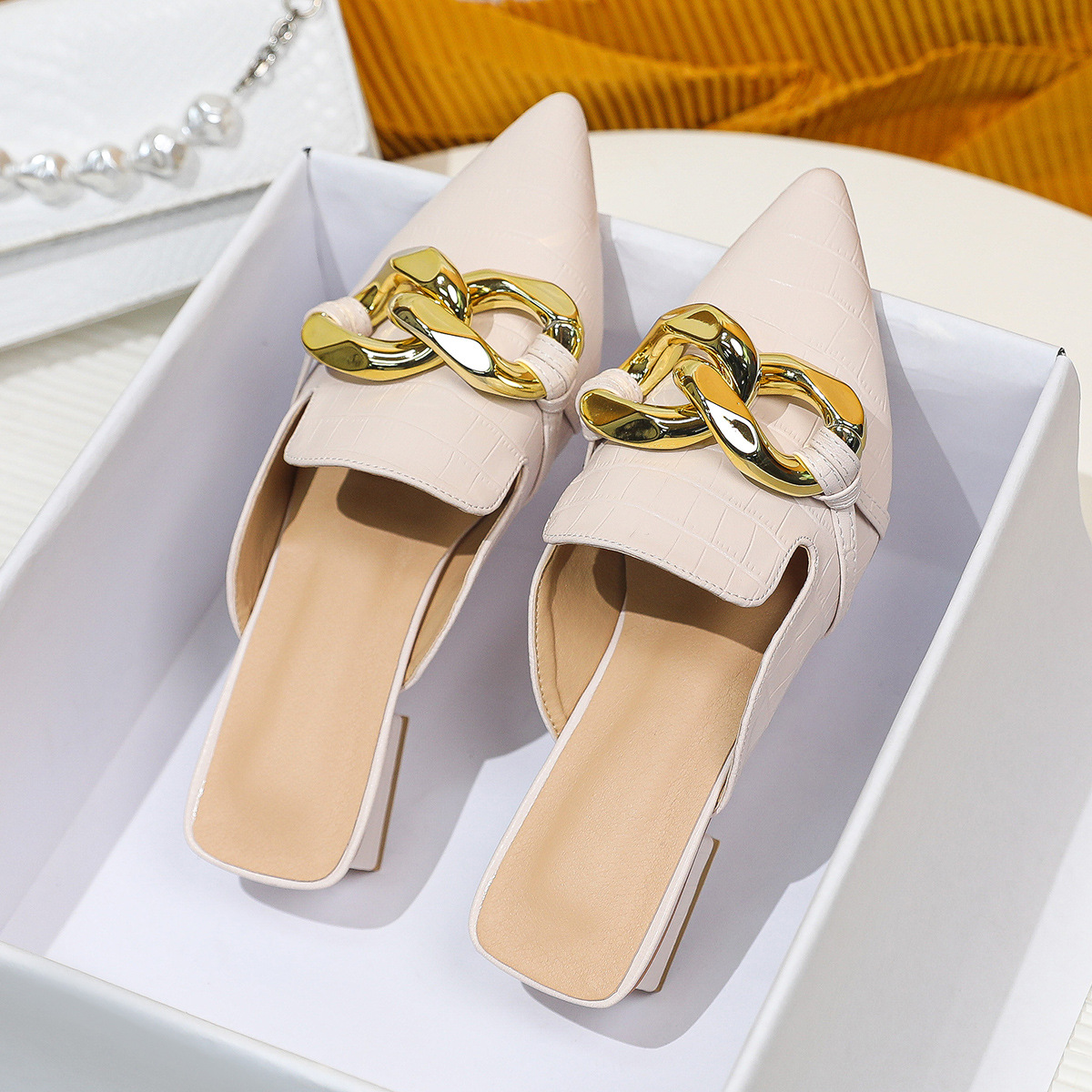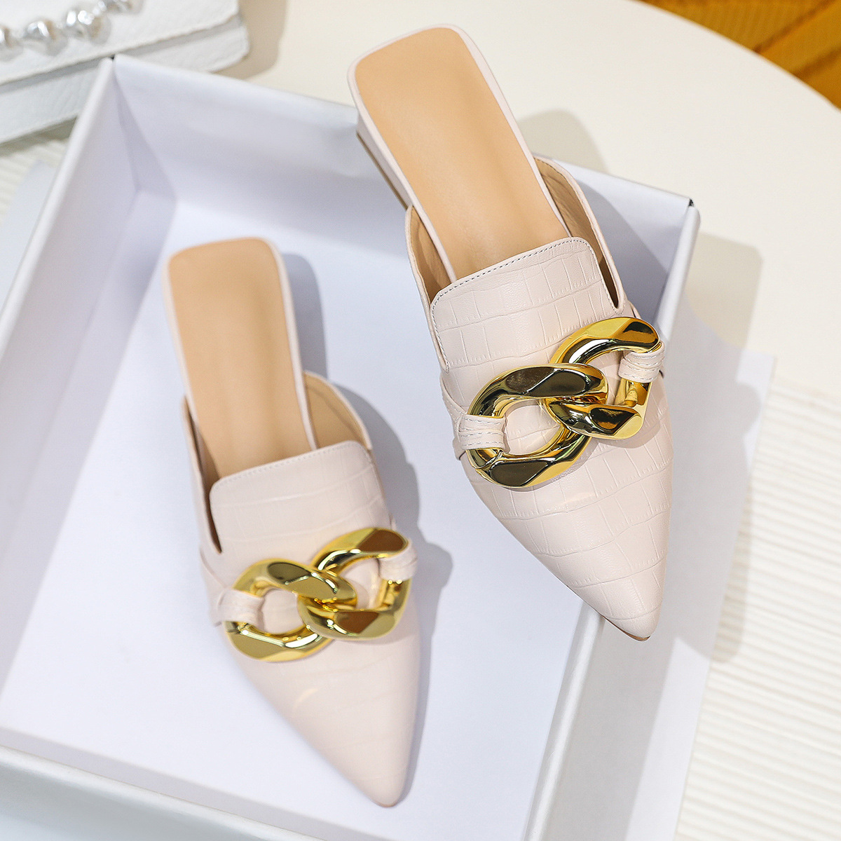 Baotou Half Slippers Women's 2023 Summer New European and American Cross-border All-match Pointed Toe Shallow Mouth Metal Buckle Flat Shoes