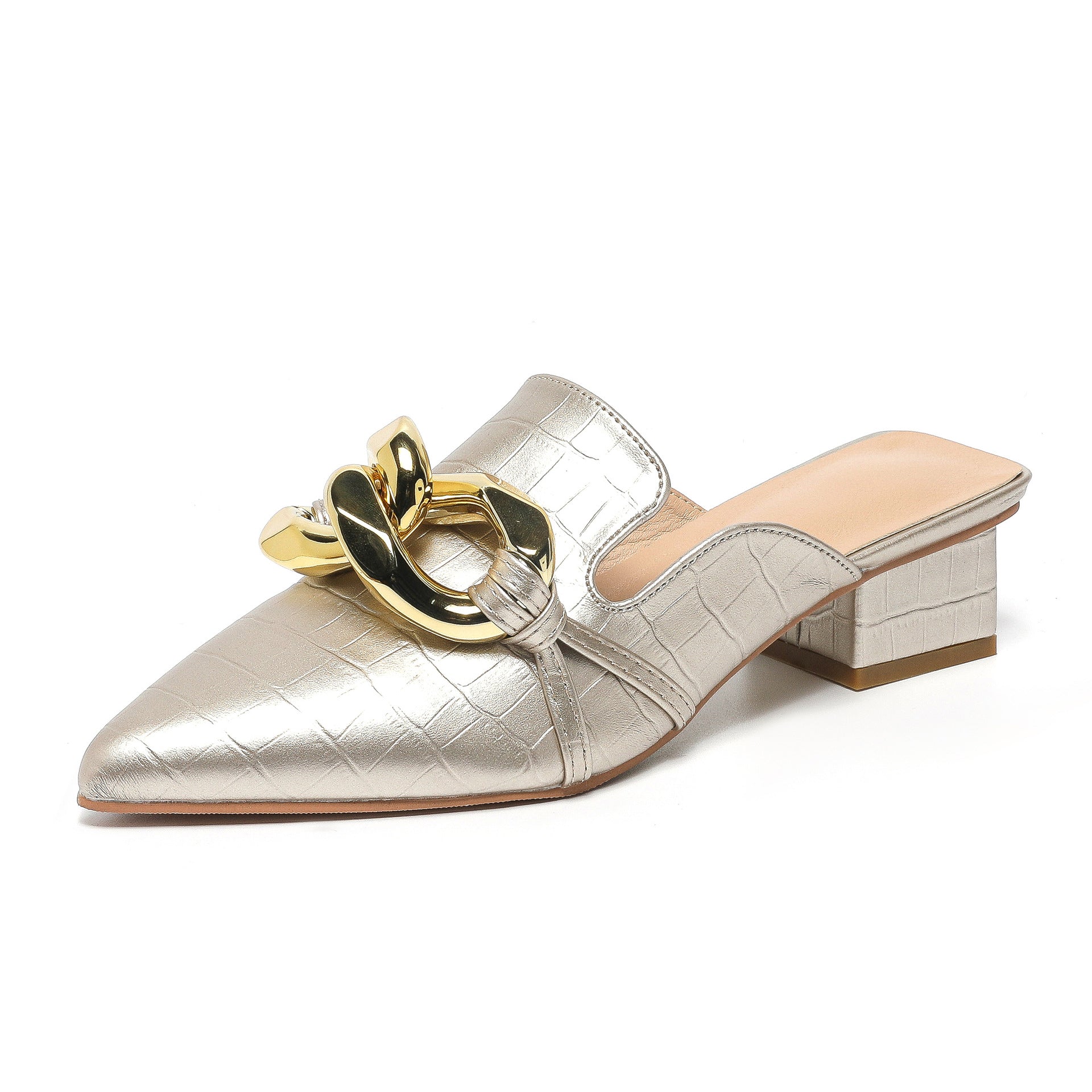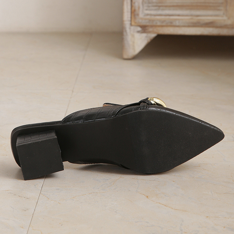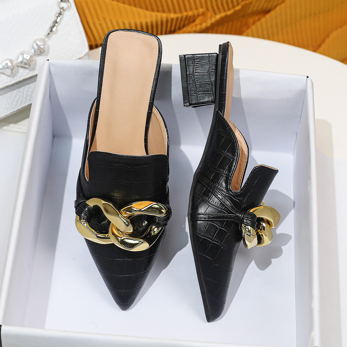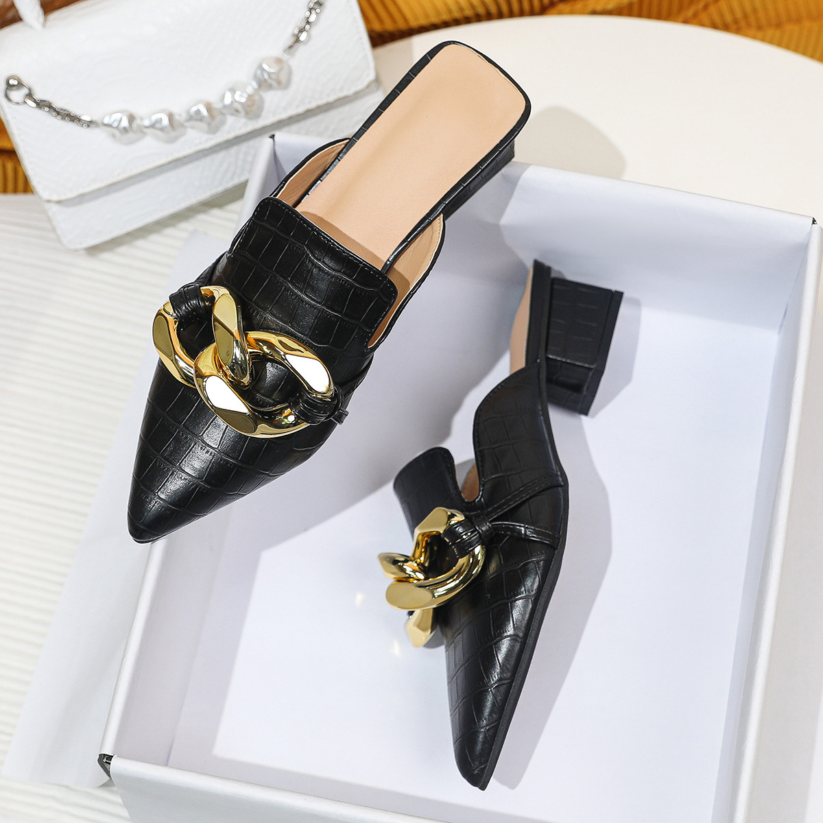 Baotou Half Slippers Women's 2023 Summer New European and American Cross-border All-match Pointed Toe Shallow Mouth Metal Buckle Flat Shoes