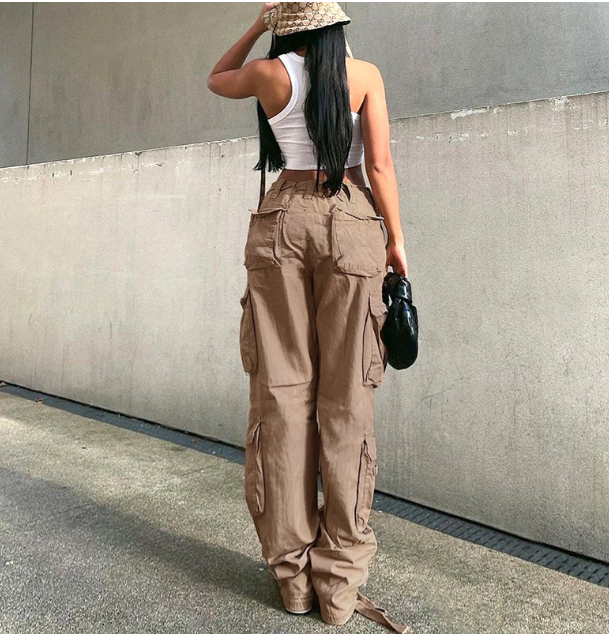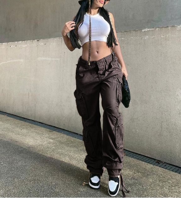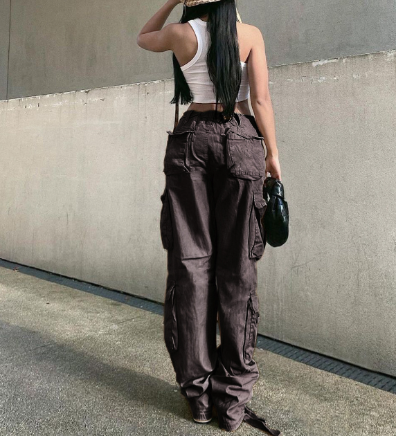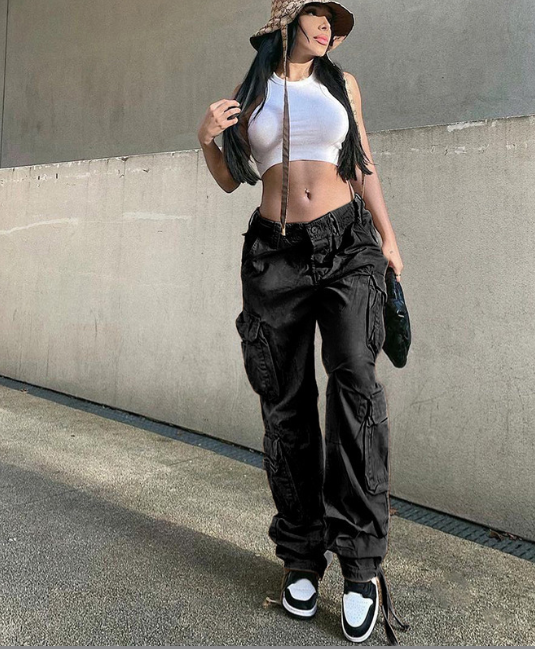 Black Flap Pockets Cargo Pants Loose Fit Wide Legs Baggy Straight Jeans Y2K Kpop Vintage Style Women's Denim Jeans & Clothing
