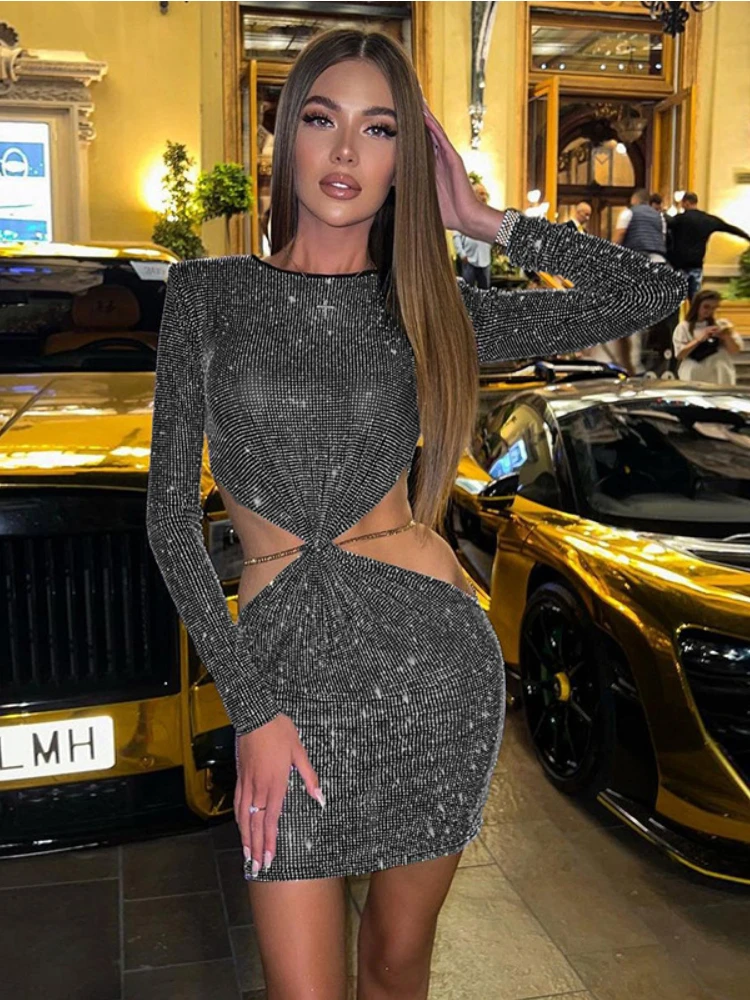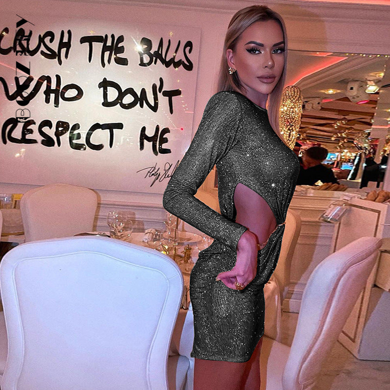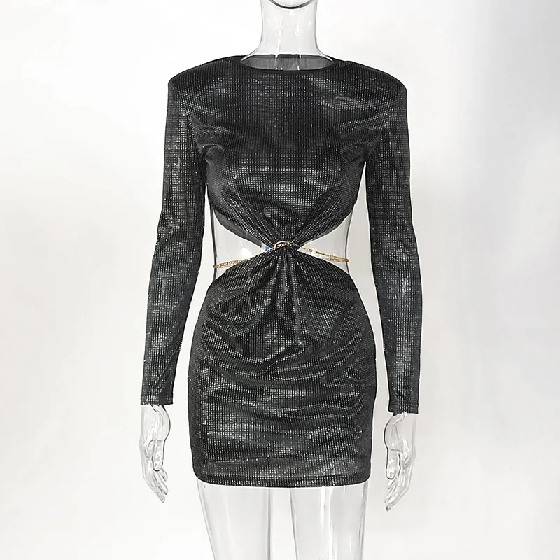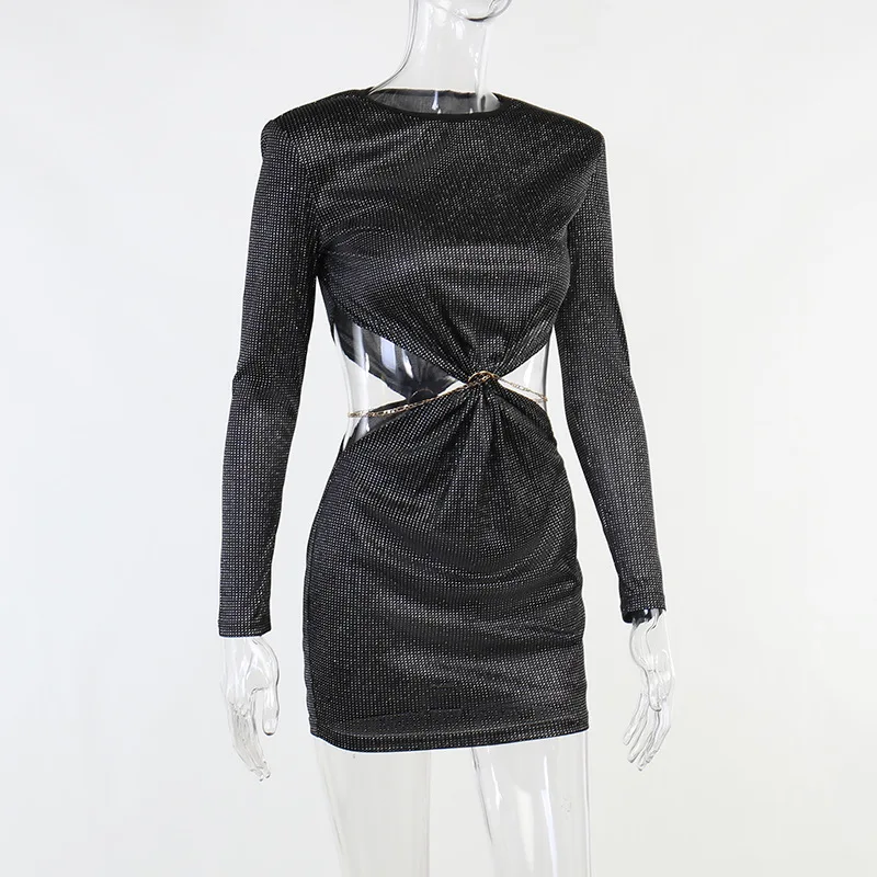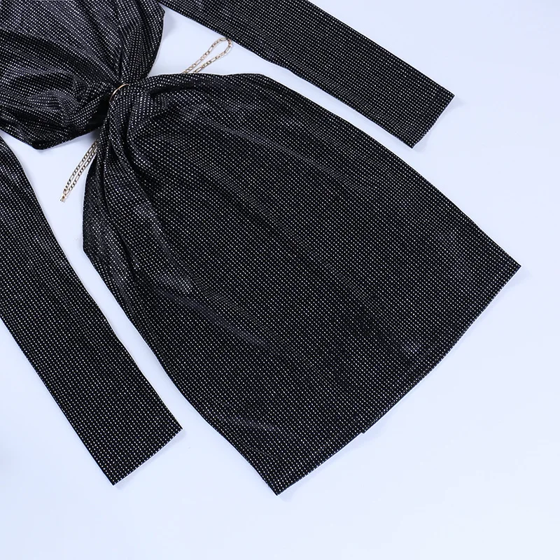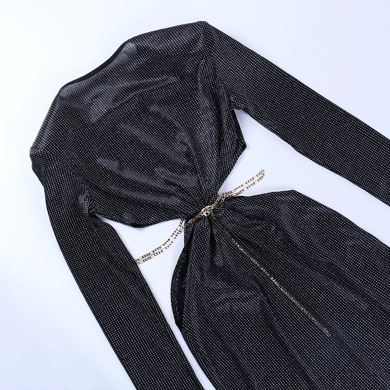 BoozRey Black Sexy Hollow Out Mini Wrap Dress for Women Summer Rave Festival Outfits Shoulder Pads Long Sleeves Skinny Dresses