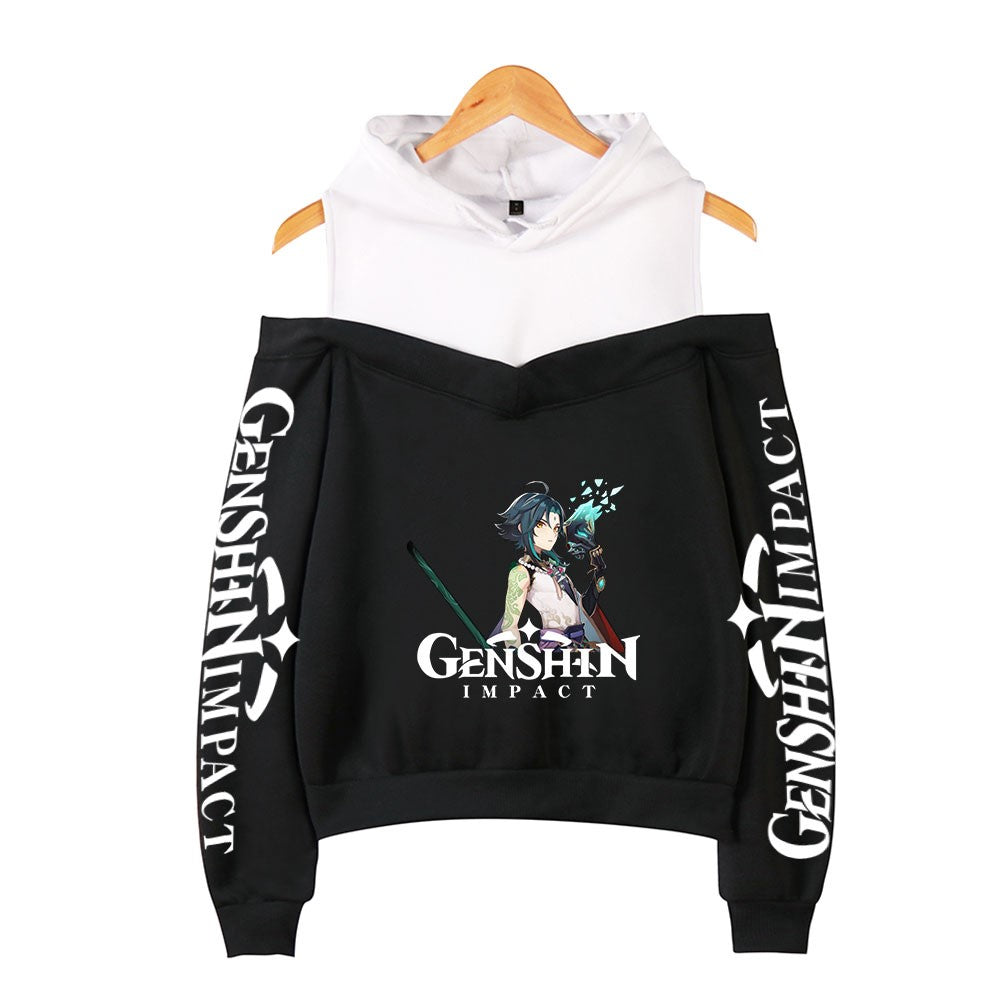 Genshin Impact Hoodies Women's Off-shoulder Hoodie Sweatshirt Autumn Winter Hoodie Harajuku Cartoon Xiao Off-shoulder Sweatshirt