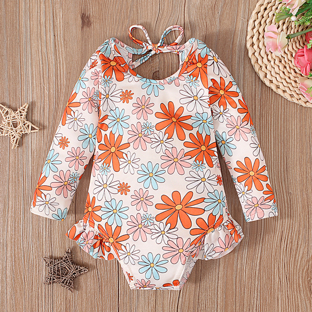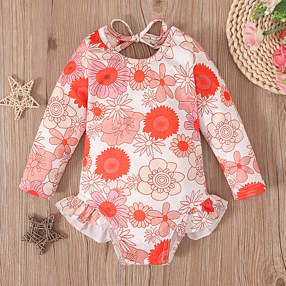Infant Baby Girl Swimwear Lovely Floral Backless Lacing Up Long Sleeve Ruffle Hem Bodysuit Bathing Suit Kids Girl Beachwear 0-3Y