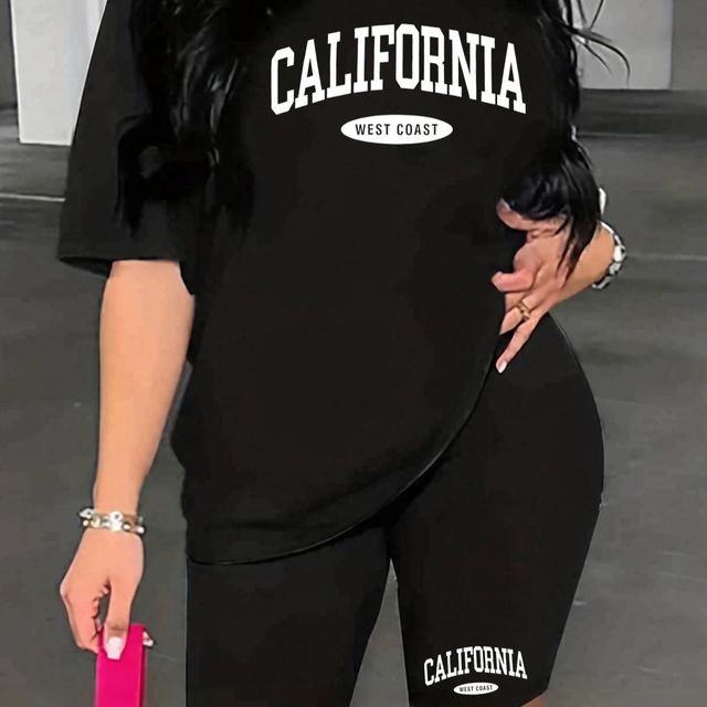 letter Print Two-piece Set, Short Sleeve Crew Neck Casual T-Shirt & Shorts 2pcs Outfits For Summer & Spring, Women's Clothing