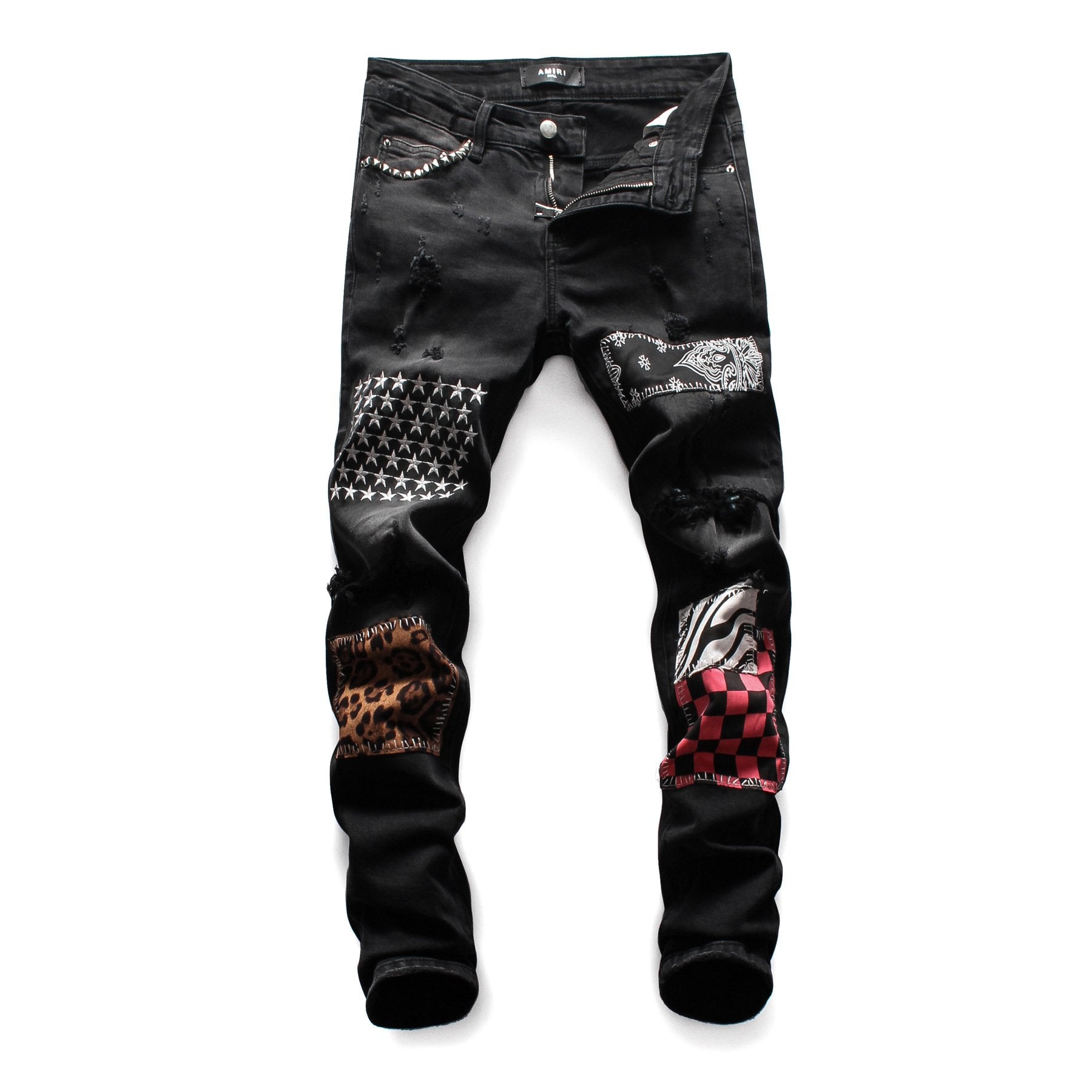 Men's Black Patch Jeans Slim Fit Hong Kong Style