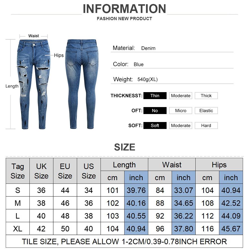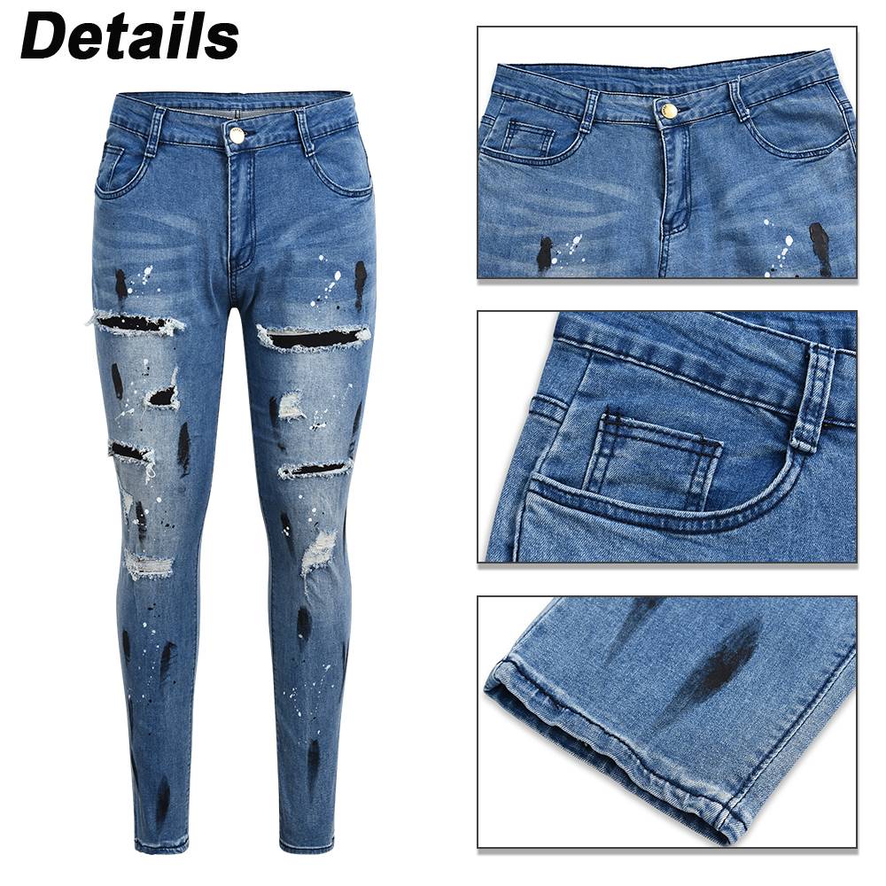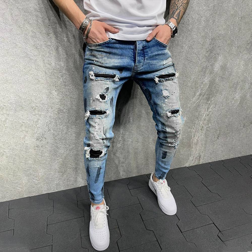 New Fashion Design Hole Slim Jeans Men's Paint Ripped Stitching Skinny Denim Pants Casual Hollow Out Zipper Denim Trousers