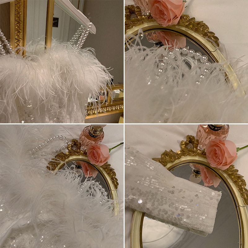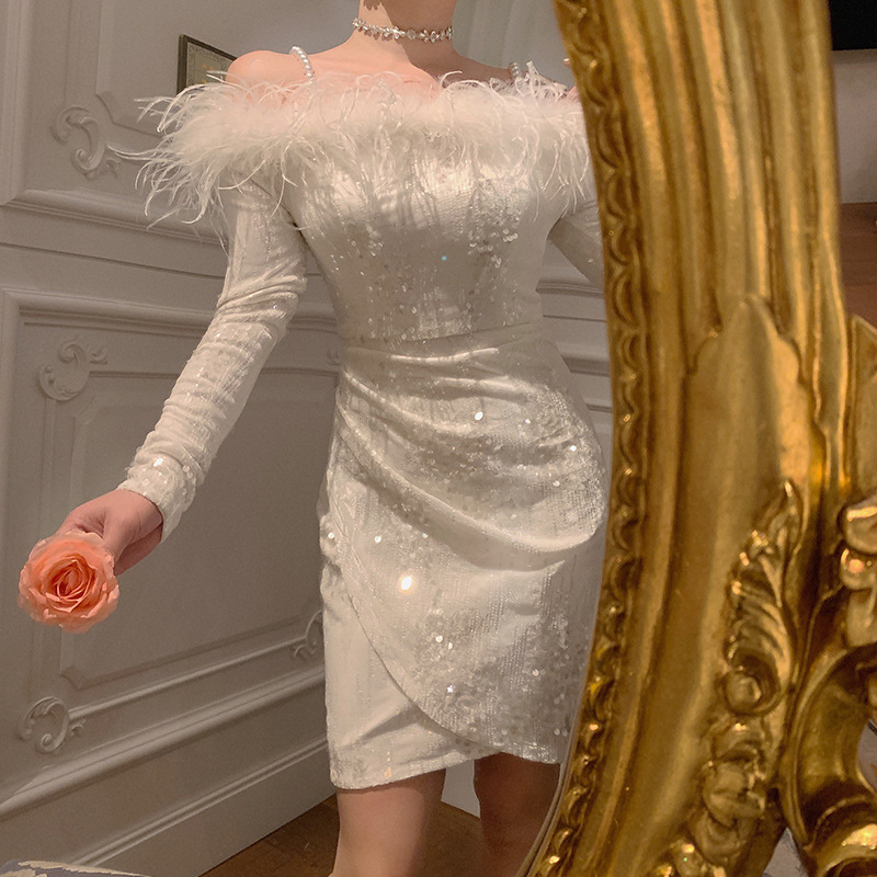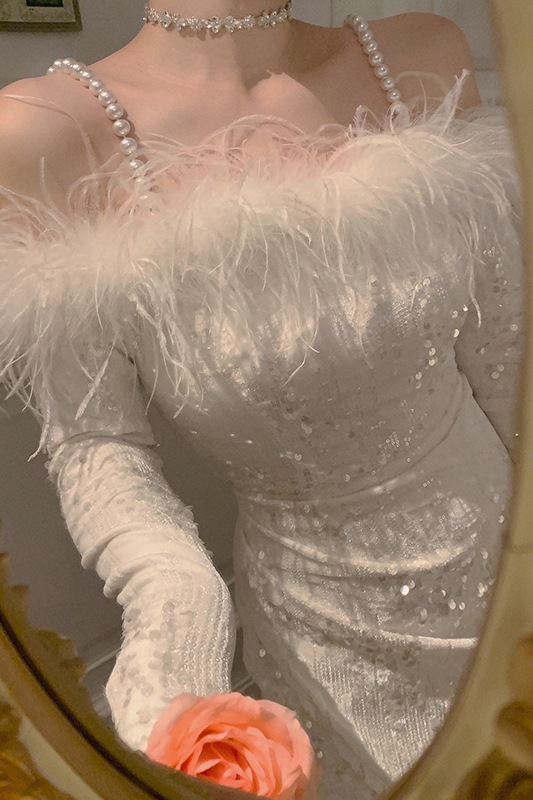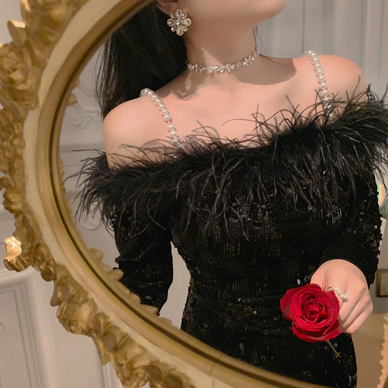 Sequined Feather Off-shoulder New Banquet Party C- Bit Evening Dress For Women