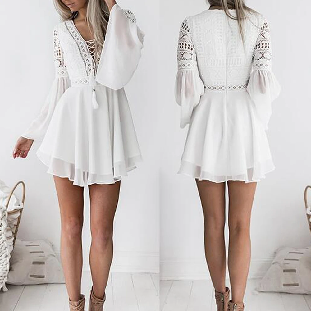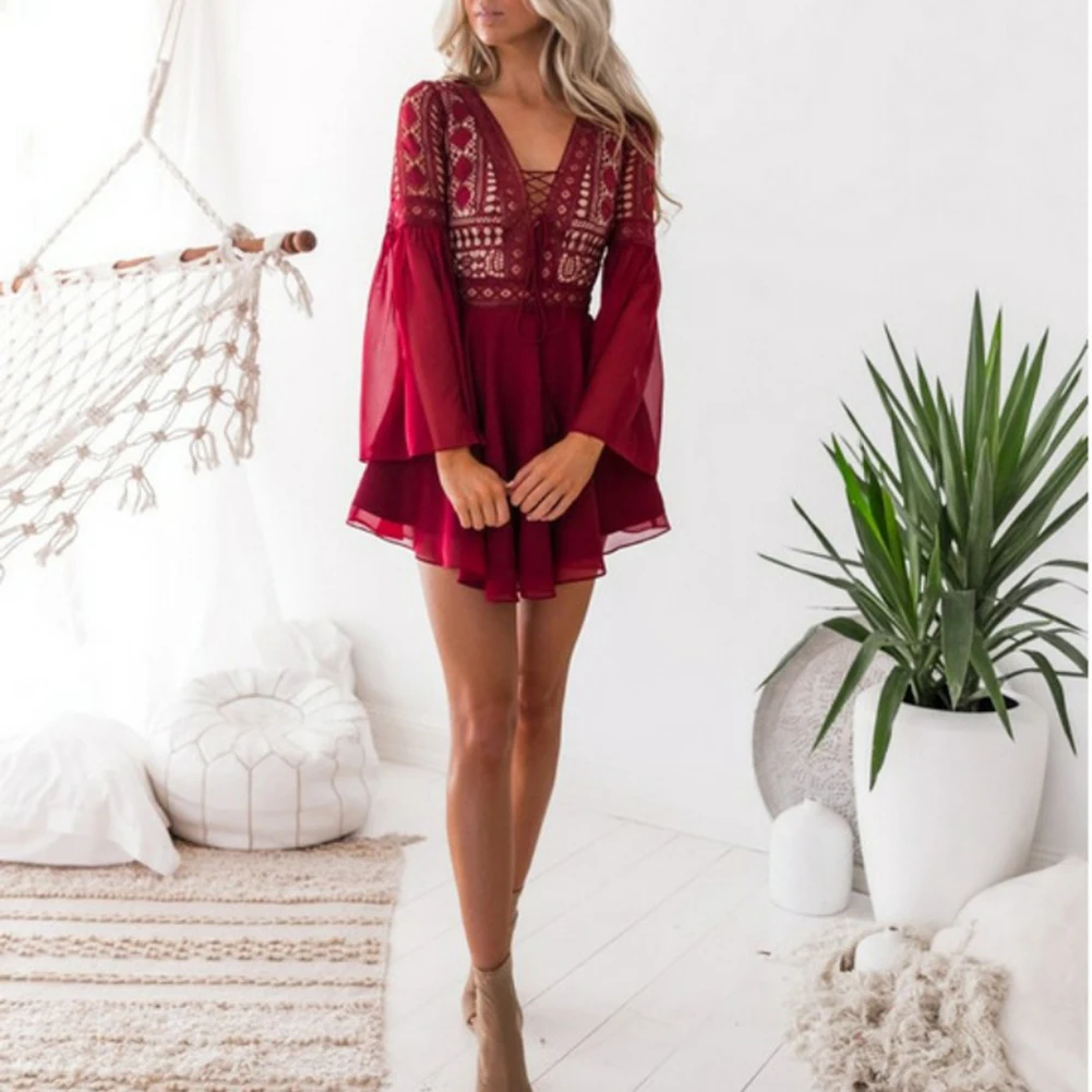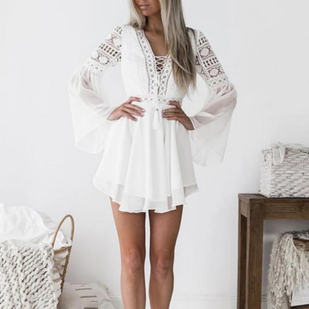 Sexy V Neck Women's Spring Summer Dress Long Flared Sleeve Mini Dress Crochet Hollow out Sexy Chiffon Bandage Mini Dress 2020