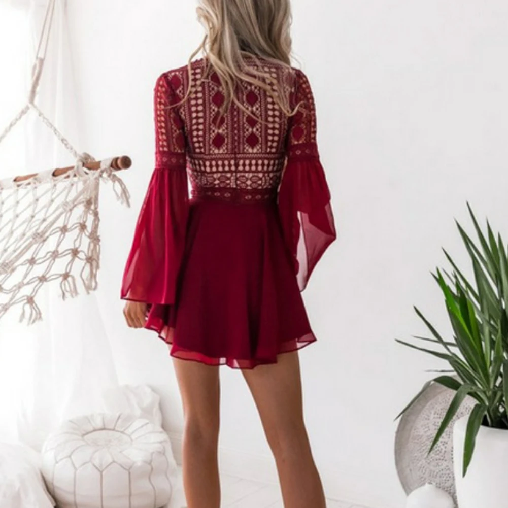 Women V Neck Long Flared Sleeve Crochet Hollow out Chiffon Bandage Mini Dress