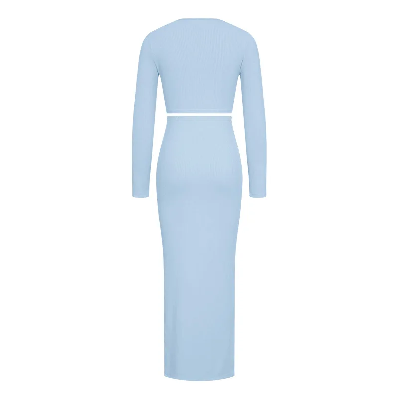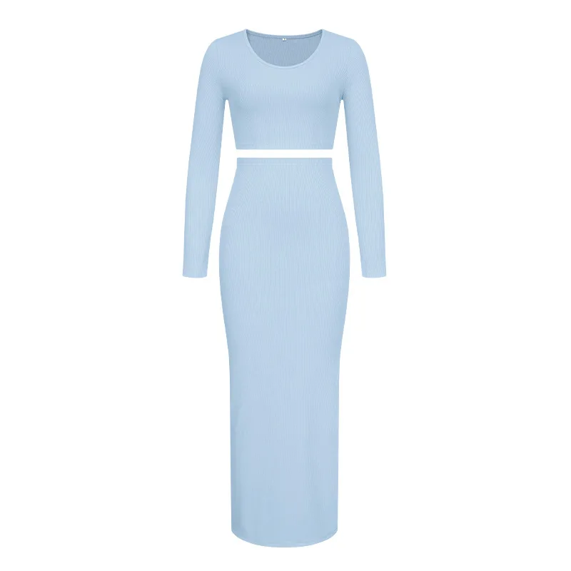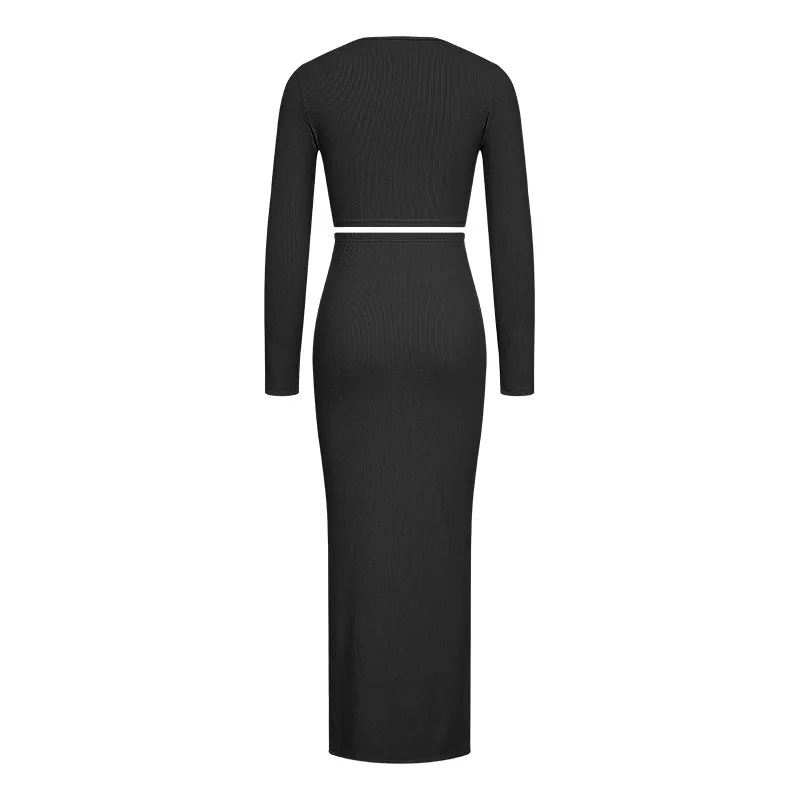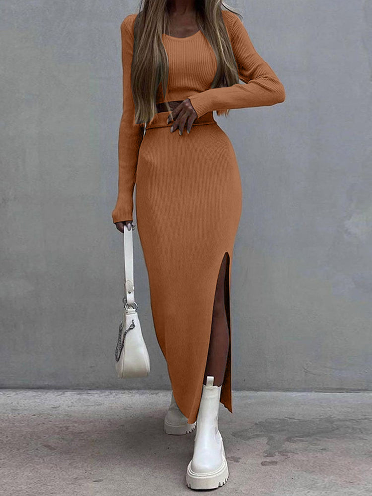 Spring Two Piece Sets Women Knitted Sweater Skirt Suit Streetwear Fashion Long Sleeve Sexy Slim Crop Tops Long Split Skirt Dress
