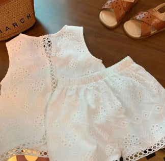 Summer Children Baby Girl 2PC Clothes Set Cotton Hollow Lace Sleeveless Vest Elastic Waist Shorts Suit Toddler Girls Outfit