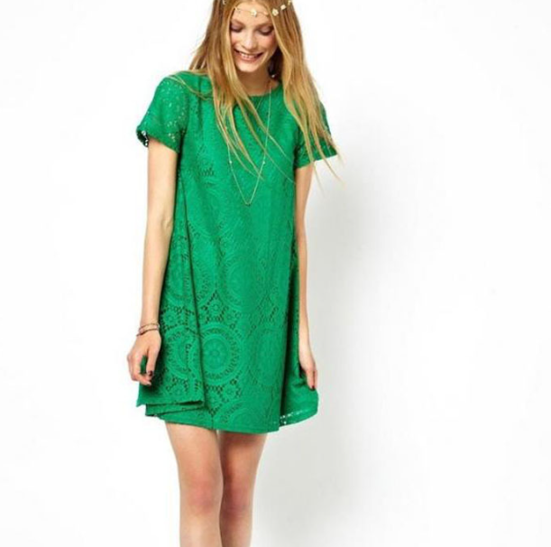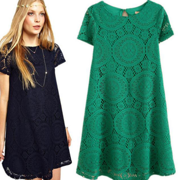 Summer large size women's dress, European and American dress, loose short sleeves, hollowed out kaleidoscope style, lace, a skirt.