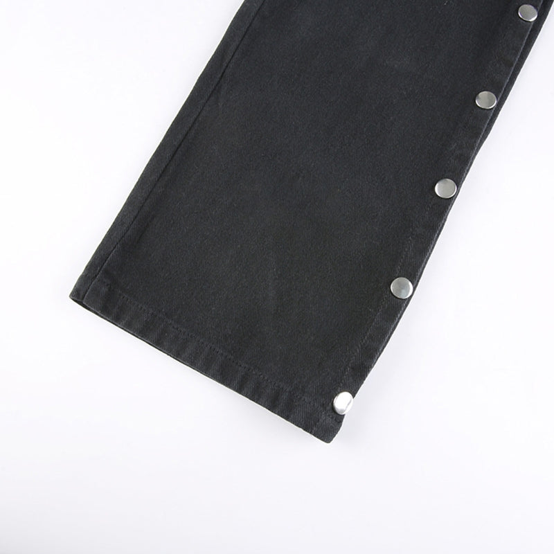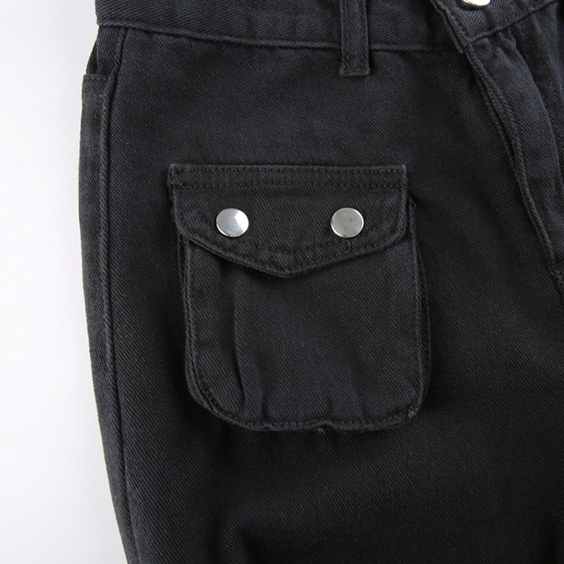 Women Black Cargo Jeans with Multi Pockets Metal Buckle Belt Straight Trousers Dropship