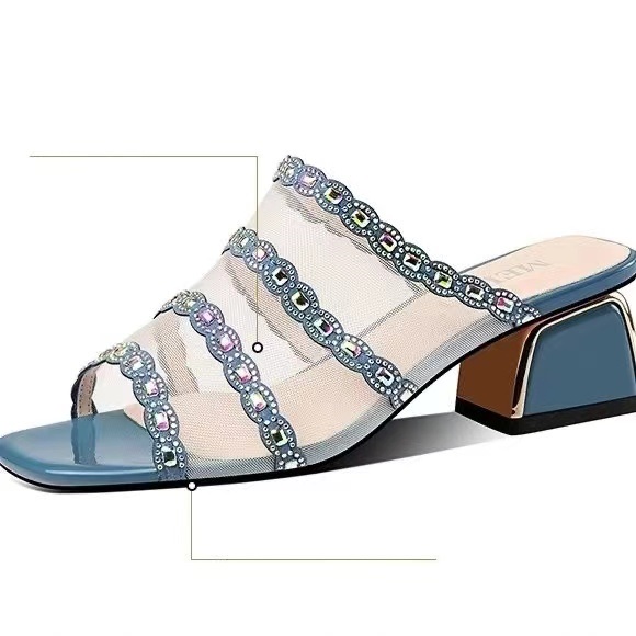 Women's Colored Diamond Breathable Mesh Mid-heel Sandals And Slippers