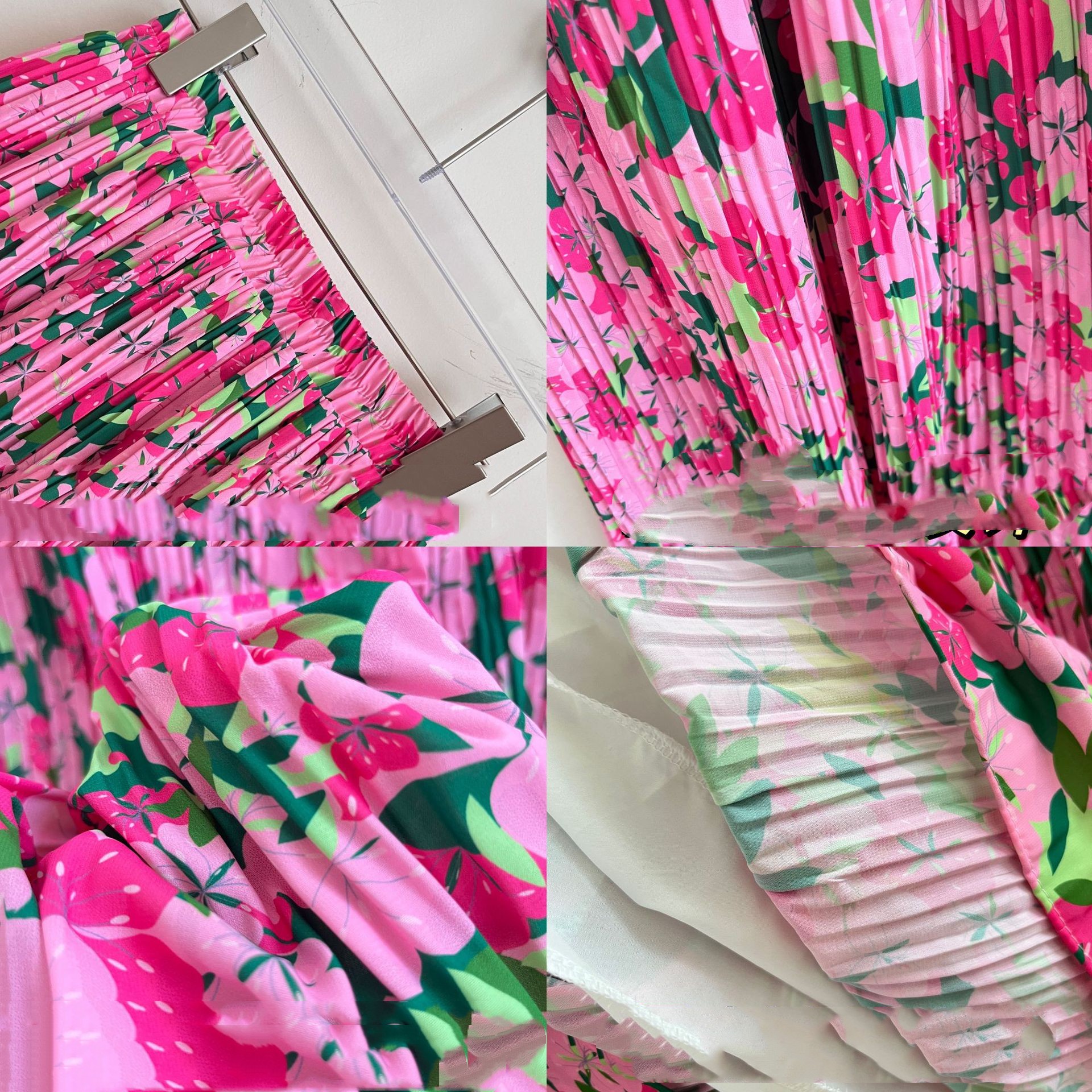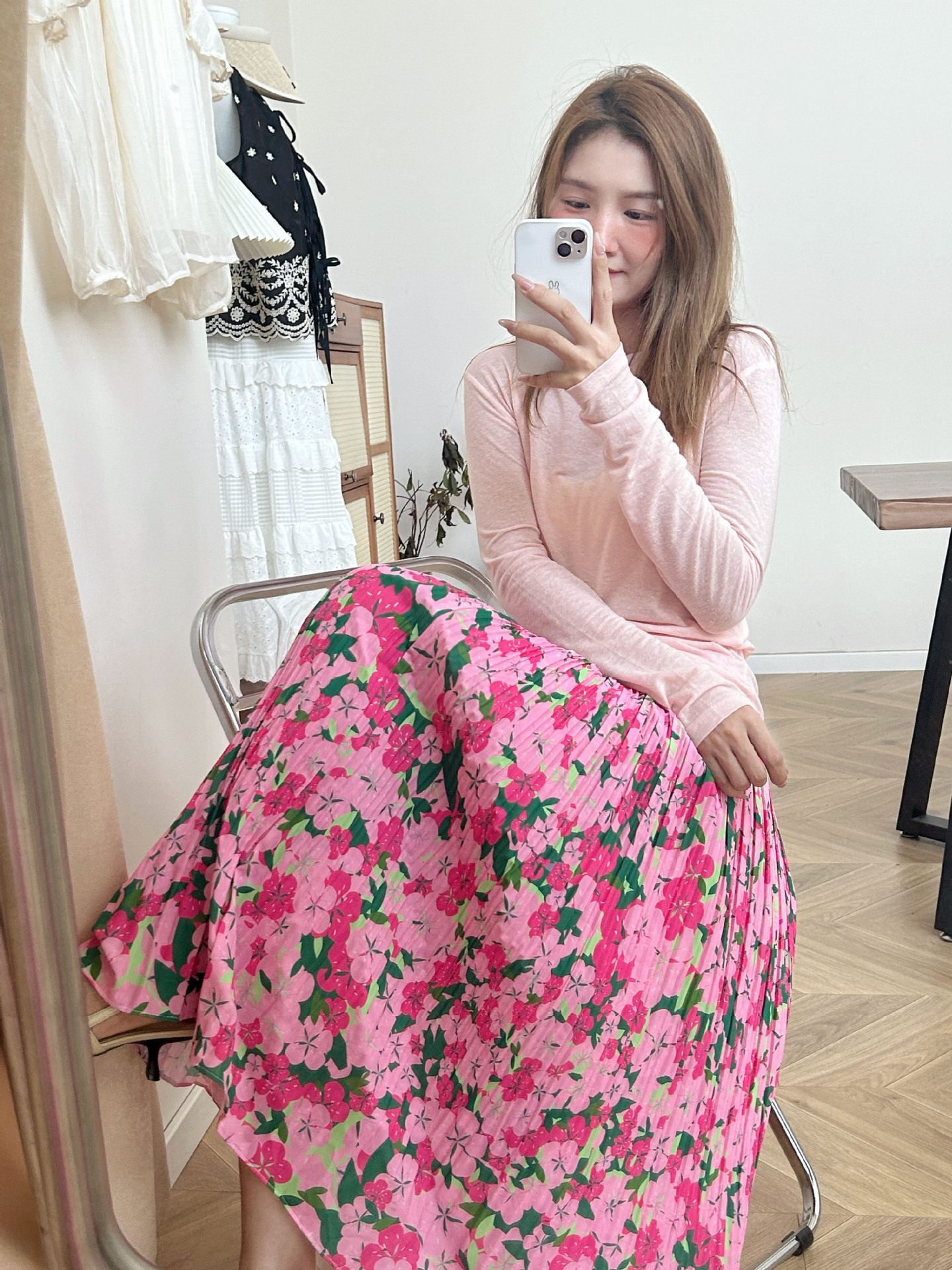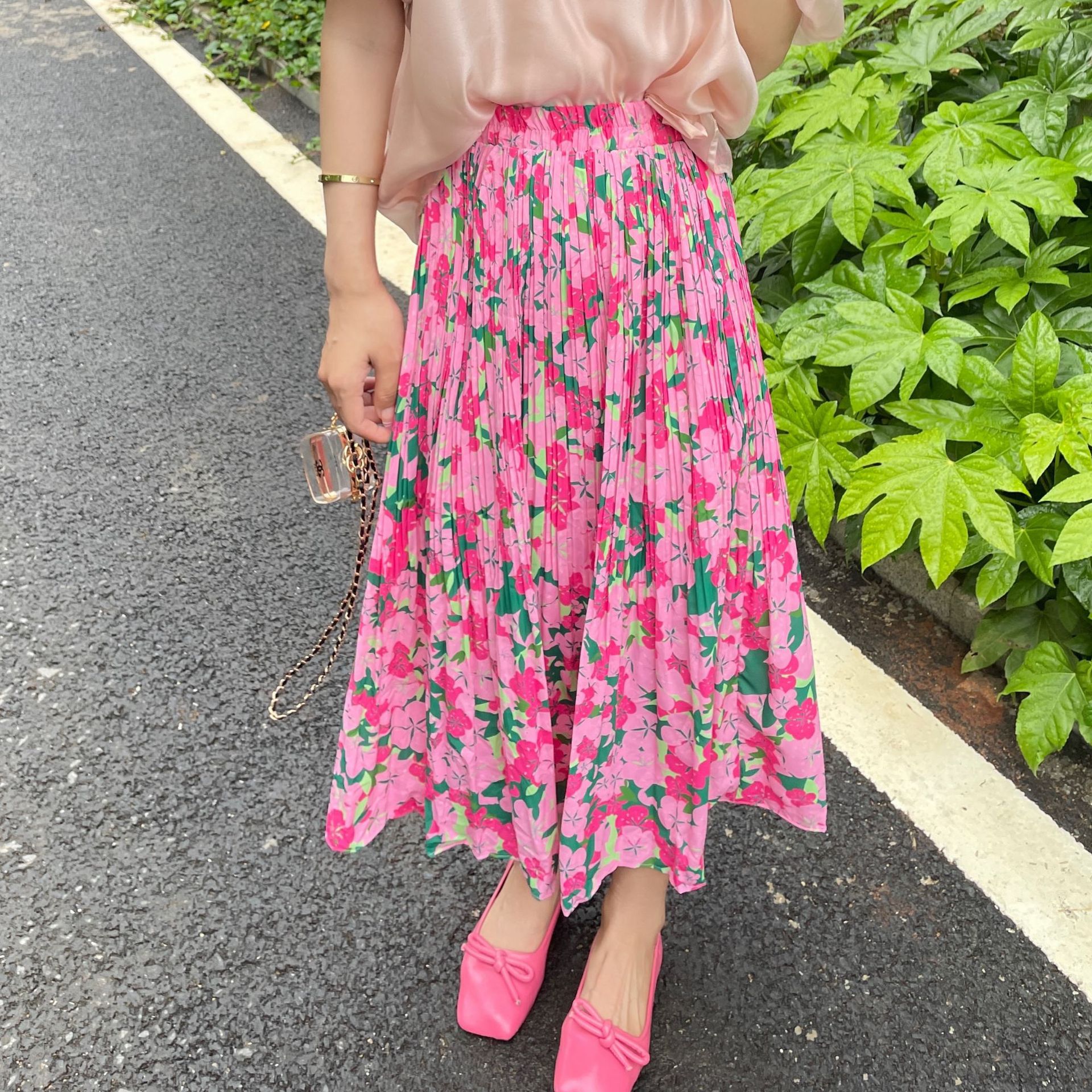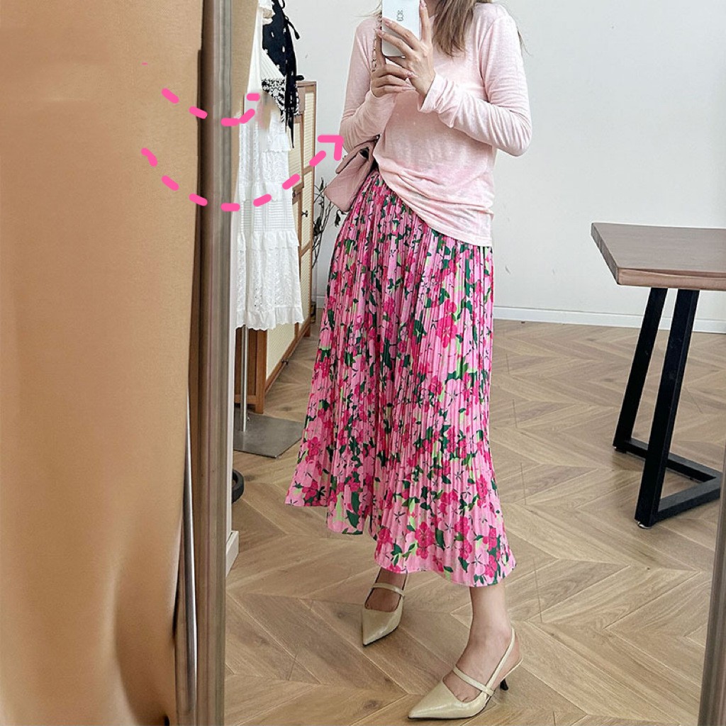 Color: Oil painting pleated skirt, peach stretch bottoming shirt