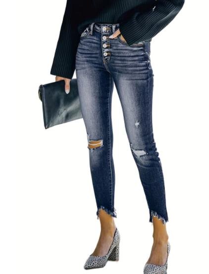 Women's Stone Wash Distressed Blue Jeans - Mid-Rise Knee Cut Raw Hem Skinny Jean Pants